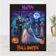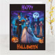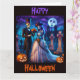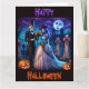 Uma noiva e noiva assustadora e bonita em um casamento estranho na noite de Halloween em um cemitério assustador. Adicione seu próprio texto personalizado.