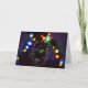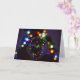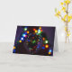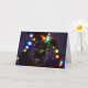 Uma mão segura uma bola de cristal em frente a uma exibição vibrante e multicolorida de luzes de férias fora de foco. A esfera captura e reflete uma bela visão de uma árvore de Natal decorada. Este cartão de saudação de Natal apresenta uma fotografia de cobrir e um trabalho de arte desenhado à mão pelo fotógrafo principal, criador do Deus abençoe Keg Publishing LLC, Paul John Hausleben.
