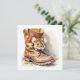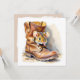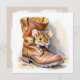 Uma pequena ilustração de aquarela com um mouse saindo de uma bota marrom antiga. Placa de vazio.