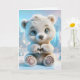 Um filhote de ursos polares bonitinho com olhos e patas grandes e expressivos em posição cardíaca se senta em uma paisagem nevada rodeada por cristais de gelo espumantes para uma Dia de os namorados neta. O texto pode ser alterado.