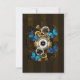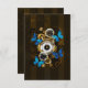 Composição do relógio de aço redondo com discagem numérica romana preta, decorado com engrenagens de ouro e latão, borboletas morfo azuis e lentes danificadas sobre fundo listrado castanho. Estilo Steampunk.