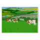 Ilustração de três vacas castanhas e brancas a pastar num campo verde tendo em vista os prados e o campo à distância. Imagem disponível em vários presentes e produtos.