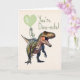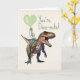 "Dino-mite" tema do valentine com ilustração de um dinossauro com balão verde em forma de coração. Personalize o texto interno.