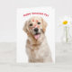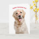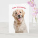Cachorro golden retriever com beijos de batom vermelho em fundo branco.