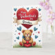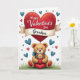 This card shows a large red heart at the top, with a stitched look like a cozy plush patch. Across the heart is a cream banner with the words “Happy Valentine’s Day Grandson” written in a simple, flowing letter style. Below it, on a thin strip of green grass, sits a chubby golden-brown teddy bear with a gentle smile and slightly rosy cheeks. Tucked in the big bear’s left arm is a smaller teddy bear, also smiling, and together they hold a red heart between them. The background is white with small floating hearts in red and teal scattered around, like love drifting down from above. The whole scene feels tender and safe, like a hug you can give in card form 🥰❤️. It’s a sweet way to remind your grandson he’s loved and thought of on Valentine’s Day, and it makes sharing Valentine’s Day feel easy and sincere.