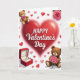 This card features a glowing red heart centered on a bright white background, setting a sweet Valentine’s mood ❤️. Across the heart, the words “HAPPY Valentine’s Day” sit neatly in the middle in a graceful, flowing style, standing out clearly against the red. A teddy bear peeks in from the top-left corner as if shyly joining in, while another teddy bear rests at the bottom-right, holding a small bouquet of pink roses close to its chest 🥰. In the top-right, a single pink rose opens wide with green leaves that add a soft, natural contrast. At the bottom-left, an open red velvet ring box reveals a gold band topped with a sparkling diamond, catching the light like a quiet promise. Small ruby-red and candy-pink hearts drift across the background, giving the scene a light, floating feel. The bears look plush and cuddly, the heart looks glossy, and the ring and diamond glint with tiny highlights against the white space. A gentle, diffused glow surrounds the central heart, while the scattered hearts appear in different sizes across the page.