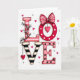 This greeting card features the word “LOVE” displayed as four separate decorative letters on a white background. Each letter has its own unique look, giving the design a hand-crafted feel. The “L” shows soft pink and white stripes, wrapped with curling dark green leaves along the edges. The “O” appears as a red circle covered in polka dots, topped with a red-and-white gingham bow, with a deep red heart hanging below it. The “V” is styled with bold black and white stripes and has another red heart dangling from its point. The “E” is light pink with tiny black stars scattered across it. Extra fuchsia hearts and small black cross marks are sprinkled around the letters, adding detail and warmth. Gentle shading makes the letters appear slightly raised, creating a thoughtful and charming design that’s perfect for sharing love, affection, or Valentine’s Day wishes with someone special.❤️