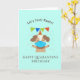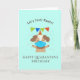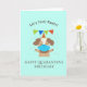este doce e engraçado cartão pastel de turquesa apresenta um cachorro/cachorrinho com máscara e um chapéu de aniversário com uma mensagem de trocadilho animal não deixa feliz feliz aniversário em quarentena. o cartão perfeito para distanciamento social