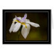 Os Dewdrops da chuva recente descansam nas pétalas da orquídea selvagem branca bonita. A flor está para fora contra o marrom escuro e cores verdes do fundo. Este cartão de nota vazio está pronto para ser personalizado com seu próprio texto. Selecione diversos destes cartões de nota vazios e dê-os em um grupo como um presente. Pode igualmente ser pedido como um cartão 5x7 regular.
