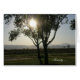 A luz do sol espiando pelos ramos de uma árvore na borda das fazendas. Placa de vazio - coloque seu dentro de saudação personalizado.