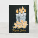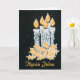 Um cartão chic de Natal com a saudação em finlandês e cinco velas com holly, pintada à mão em ouro e prata em fundo preto estrelado.