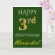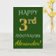 Este simples e personalizado design de cartão de felicitações de aniversário de casamento apresenta a mensagem "FELIZ 3º ANIVERSÁRIO", com o "3º" tendo uma aparência semelhante a ouro. A frente também apresenta um nome personalizado e um fundo verde. O interior apresenta uma mensagem personalizada de felicitações de aniversário de casamento. Pode ser dado a um marido ou uma esposa em celebração do terceiro aniversário de casamento do casal. [~Z0000086]