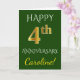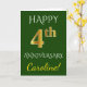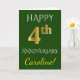 Este simples e personalizado design de cartão de saudação de aniversário de casamento apresenta a mensagem "FELIZ 4º ANIVERSÁRIO", com o "4º" tendo uma aparência semelhante ao ouro. A frente também apresenta um nome personalizado e um fundo verde. O interior apresenta uma mensagem de saudação de aniversário de casamento personalizável. Pode ser dado a um marido ou uma esposa em celebração do quarto aniversário de casamento do casal.