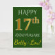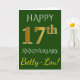 Este simples design de cartão de aniversário de casamento personalizado apresenta a mensagem "FELIZ 17º ANIVERSÁRIO", com o "17º" tendo uma aparência semelhante ao ouro falso. A frente também apresenta um nome personalizado e um fundo verde. O interior apresenta uma mensagem de aniversário de casamento personalizada. Pode ser dado a um marido ou esposa em celebração do décimo sétimo aniversário de casamento do casal. [~Z0000086]