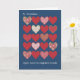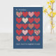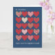 Um cartão de saudação chique para personalizar para o Dia de St Dwynwen (25 de janeiro) com fileiras de corações vermelhos e brancos em um fundo azul profundo. St Dwynwen é a padroeira dos amantes no País de Gales e este design do Dia de St Dwynwen é de uma colagem de papel pintada à mão por Judy Adamson.