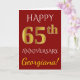 Este simples e personalizado design de cartão de aniversário de casamento apresenta a mensagem "FELIZ 65º ANIVERSÁRIO", com o "65º" tendo uma aparência semelhante ao dourado falso. A frente também apresenta um nome personalizado e um fundo de cor vermelha. O interior apresenta uma mensagem de aniversário de casamento personalizada. Pode ser dado a um marido ou uma esposa em celebração do sexagésimo quinto aniversário de casamento do casal. [~Z0000078]