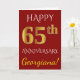 Este simples design de cartão de felicitações de aniversário de casamento personalizado apresenta a mensagem "FELIZ 65º ANIVERSÁRIO", com o "65º" tendo uma aparência semelhante a ouro falso. A frente também apresenta um nome personalizado e um fundo de cor vermelha. O interior apresenta uma mensagem de felicitações de aniversário de casamento personalizada. Pode ser dado a um marido ou esposa em celebração do sexagésimo quinto aniversário de casamento do casal. [~Z0000078]