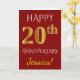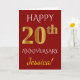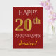 Este simples design de cartão de felicitações de aniversário de casamento personalizado apresenta a mensagem "FELIZ 20º ANIVERSÁRIO", com o "20º" tendo uma aparência semelhante a falso dourado. A frente também apresenta um nome personalizado e um fundo de cor vermelha. O interior apresenta uma mensagem de felicitações de aniversário de casamento personalizada. Pode ser dado a um marido ou uma esposa em celebração do vigésimo aniversário de casamento do casal. [~Z0000078]
