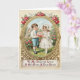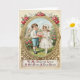 This Valentine’s Day card shows a vintage-style scene inside an oval frame with curling gold details. In the center, a winged boy in a white shirt and light blue shorts holds out a heart-shaped gift box tied with a ribbon to a girl in a white lace dress and bonnet. Their faces look calm and kind, as if they’re sharing a quiet, sweet moment in a rose garden. Above the oval, red roses and green leaves spread across the top, and two white doves sit together like a sign of lasting love. The colors are soft and faded, with gentle pinks, blues, and cream tones that make it feel like an old keepsake. Under the picture, a banner reads “To My Dearest Love, A Gift From A True Heart” in dark lettering that’s easy to read and sits centered below the frame. Little signs of age add to the cozy, romantic feel, making it perfect for a heartfelt note ❤️