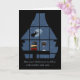 Cartão de Dia das Bruxas com tema de vinho. Super fofo, uma bruxa é vista por uma janela voando sobre sua vassoura com seu familiar, um gato. O chão tem uma mesa com livros e um copo de vinho. O cobrir diz: Que o seu Halloween seja cheio de bruxas e vinho... e o dentro... e que seja muito bom!