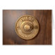 Uma campainha típica de latão brilhante com a palavra pressionada em uma superfície de madeira