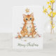 A delightful nostalgic Christmas card featuring a sweet orange kitten wrapped in colourful holiday lights. A little golden star rests playfully above its head, bringing a warm festive charm to the illustration. Soft vintage colours and gentle hand painted textures create the cosy feeling of an old fashioned Christmas. A perfect card for sharing Merry Christmas wishes with anyone who loves cute and traditional holiday artwork.