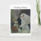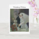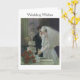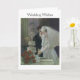 Uma ilustração vintage de uma noiva e um noivo cortando a primeira fatia do bolo de casamento. A frente da carta diz "Desejos de Casamento" e a mensagem dentro da carta é "Desejando a você muitos mais dias tão felizes quanto este, muitas mais ocasiões para celebrar, e uma vida de amor e riso."