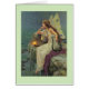 Uma ilustração vintage de uma bela fada com asas como uma borboleta e vestindo um vestido ao estilo grego. Ela senta-se sozinha a olhar para o mar à noite, atolada num caixote rochoso a subir pela água. Ela tem uma lâmpada de óleo ao seu lado que lança uma luz amarela na escuridão e um descanso harpa ao lado dela. Ela descansa seu queixo na mão, olhando para o mar escuro como se ela estivesse esperando alguém voltar para casa. O dentro da placa é vazio para sua própria mensagem