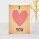 This card shows the simple message “I ♥ YOU” stacked down the center. The “I” sits at the top in dark blue letters with a slightly worn texture. A large salmon-pink heart is placed in the middle, with soft, sketchy edges that make it feel warm and human 💘. The word “YOU” appears under the heart in the same dark blue, matching the look of the “I.” Behind the text, the background is a muted creamy yellow, like an old paper sign. Around the edges and corners, there are brown, scuffed marks that give the whole card an aged, loved look