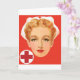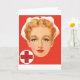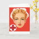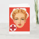Red and white design. Vintage illustration of a blond nurse with the old white cap. Red background and red cross at the bottom left.