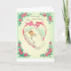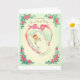 Uma ilustração do cartão de saudação vintage apresenta um novo bebê cercado por uma fita rosa amarrada em forma cardíaca. Os quatro cantos do design da carta são enfeitados com terras de flores cor-de-rosa e folhas verdes. A frente do cartão diz, "Para receber seu primeiro bebê" e a mensagem dentro do cartão é: "Para abraçar e segurar a partir deste dia. Parabéns sobre o nascimento do seu novo bebê!"