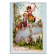 Uma imagem de cartão de Páscoa representa uma cena da floresta com duas crianças brincando e rindo sobre um grande ovo colorido de Páscoa. Um carneiro espanta-se ao seu lado com uma coroa floral ao redor do pescoço. O menino segura um cesto de flores enquanto a garota levanta um galho floral no ar em sua mão. A frente do cartão diz "Saudações Páscoas" e a mensagem dentro é: "Felz pascoa, Primavera Feliz, Feliz, Feliz Tudo!"