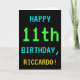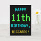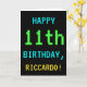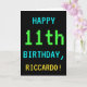 Este simples e divertido design de cartões de aniversário apresenta uma mensagem como "FELIZ 11 BIRTHDAY, RICCARDO!". Ele também apresenta uma aparência divertida e pontilhada que lembra a aparência de jogos de computador clássicos ou antigos dos anos 1980 e início dos anos 90. O nome na frente e a mensagem no dentro podem ser personalizados. Pode ser enviado ou dado a alguém que comemora o seu décimo primeiro aniversário e que gosta de jogar jogos de computador antigos. [~Z0000099]