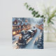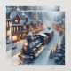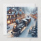 Cartão de Natal personalizado, com a ilustração ai de um comboio antigo que percorre uma aldeia de neve num dia de inverno.