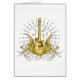 Um design musical estilo fantasia apresenta um violão alado ouro com sotaques e notas musicais repreendentes.