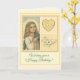 Belo cartão com a jovem Virgem Maria decorada com corações e Vazio de flores brancas no dentro para personalização.