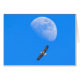 Uma águia-careca subadulta voa no céu com uma lua de três quartos no céu atrás.