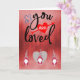 Cartão de dia de os namorados com as palavras "Você é Amado", sobre um fundo vermelho de neve com árvores, e três Gnomos vestidos para o feriado. As palavras na frente são permanentes. Você pode mudar as palavras dentro. Obrigados para cortes de Design e malha criativa para alguns dos elementos no design.