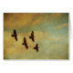 Foto de quatro corvos que voam na formação após as nuvens em um céu azul. Uma textura foi adicionada a esta imagem para dar-lhe um olhar antigo.