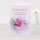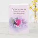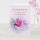 Um cartão de aniversário romântico e sentimental para o seu cônjuge com uma fotografia de uma rosa cor-de-rosa emoldurada com suaves espirais de filigrana. A frente diz: No dia do nosso casamento, eu prometi amar, honrar e te proteger para sempre.