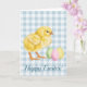 Destei's watercolor baby chick and pastel eggs. The background features a blue gingham pattern. There is also a personalizable text area that now reads: "Happy Easter!" in blue color script font.