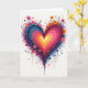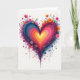 This greeting card features a large heart in the center on a white background, painted with wide, swirling strokes. The heart glows from a yellow middle and shifts outward through orange, red, hot pink, purple, and then deep blue along the edges. Around it are small, simple flowers in pink, orange, and purple, plus thin dark stems that look like they’re growing from the heart. You’ll also see scattered paint dots and drips that run down and out from the heart, giving it an energetic, artsy look. The heart feels warm and hopeful, like a big burst of affection ❤️.