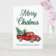 Um belo cartão de férias dobrado, com o moderno roteiro de caligrafia Feliz Natal com um caminhão vermelho-aquarela, árvores de natal e neve.