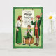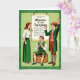Designed with a festive border of shamrocks, this St. Patrick’s Day scene shows three friends gathered around a large scroll of sheet music, setting a cozy, old-fashioned mood 💚. The scroll sits prominently in the middle and is titled “Wearing of the Green” in dark lettering that stands out against the pale paper. At center, a man in an emerald long coat and reddish-pink waistcoat lifts one hand as if guiding the tune, his face turned toward the others like he’s sharing a favorite chorus. Beside him, an auburn-haired woman in a flowing green skirt and white blouse leans in with an affectionate, attentive look, her hands poised as though she’s about to sing along ☘️. In the foreground, a young boy perches on a wicker basket, studying the silver flute in his hands with quiet focus, ready to join the group. The background is washed in layered greens, while warm reds and browns appear in small details like clothing accents and shoes, giving the picture a gentle contrast. The shamrock border frames the trio all around, with little clovers repeating along the edges.