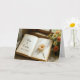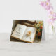 An open book with a couple's names and wedding rests on a lace-covered table by a window, adorned by a single flower placed on its pages, alongside a bouquet of similar flowers.