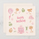 Cute birthday card with whimsically illustrated birthday icons like a balloon, birthday cake, cupcake, etc.