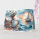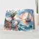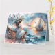An ethereal watercolor seascape capturing a quiet moment where ocean and soul meet. A graceful woman sits upon a weathered dock, her floral-crowned hair drifting in the breeze as a sailboat glides toward the glowing horizon. Soft indigo and coral tones mingle with drifting clouds, creating a tranquil balance of light and sea. This romantic coastal vision evokes reflection, freedom, and the timeless pull of distant shores. AI generated artwork.