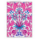 Cartão de nota com um padrão vintage William Morris de hiacintas, tulipas e folhas, em tons de fúsia e de cor-de-rosa macio, acentuados com azul escuro e turquesa, sobre fundo branco