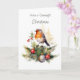 Celebrate the festive season with this winter scene: watercolor illustration of red- breasted robin perched on a branch of pine.