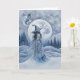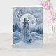Cartão Solstício de inverno com uma mulher bonito e bruxa do tipo arte popular e coruja numa lua de cheio com neve e árvores. Ele tem um tipo de sentimento místico vintage para ele pelo ítrio mágico.